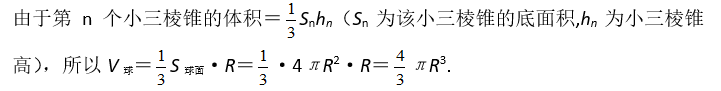 ⑴球的体积公式可以这样来考虑:我们把球面分成若干个边是曲线的小“曲边三角形”;以球心为顶点,以这些小曲边三角形的顶点为底面三角形的顶点,得到若干个小三棱锥,所有这些小三棱锥的体积和可以看作是球体积的近似值.当小三棱锥的个数无限增加,且所有这些小三棱锥的底面积无限变小时,小三棱锥的体积和就变成球体积,同时小三棱锥底面面积的和就变成球面面积,小三棱锥高变成球半径。