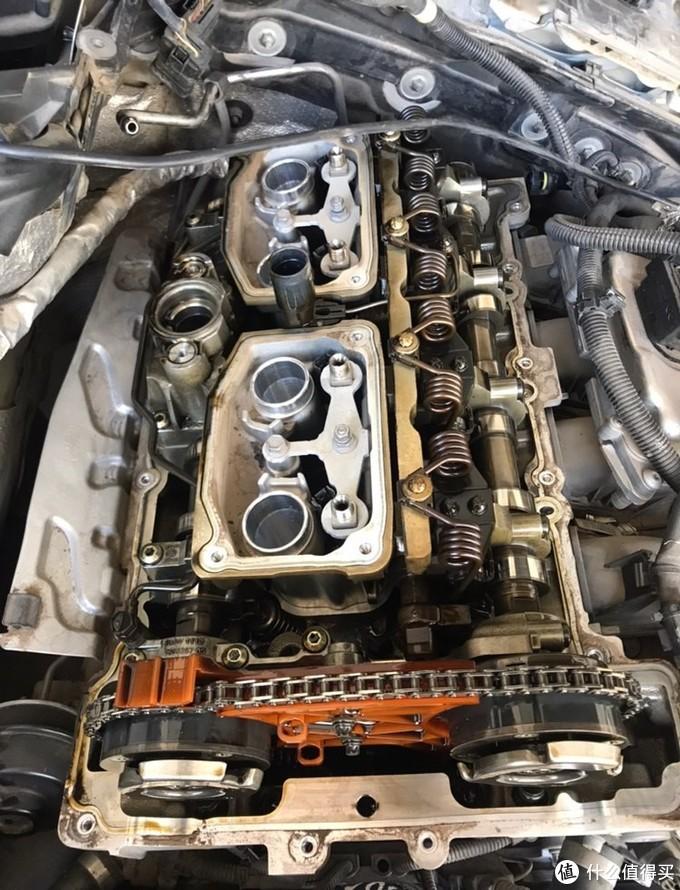 上图是真实车主一直用水油保养6年15w公里的发动机开盖图,这次开盖的原因是正时链条导向板断裂,不过我们可以看得到这个发动机内部实在是太干净了,干净的像新的一样。