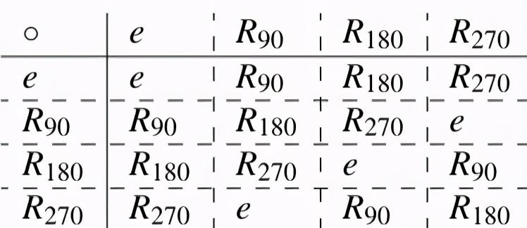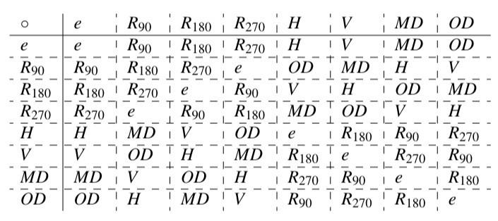 在这个表中,R下标90,180和270年表示逆时针旋转到90度,180度和270度,H表示绕水平线翻转,V表示绕垂直线翻转,MD表示绕从左上角到右下角的对角线翻转,OD则表示绕另一对角线翻转。要找出A与B的乘积,首先到A行,再到B列,并找出它们的乘积。例如:H∘MD=R₉₀(查表得到)。