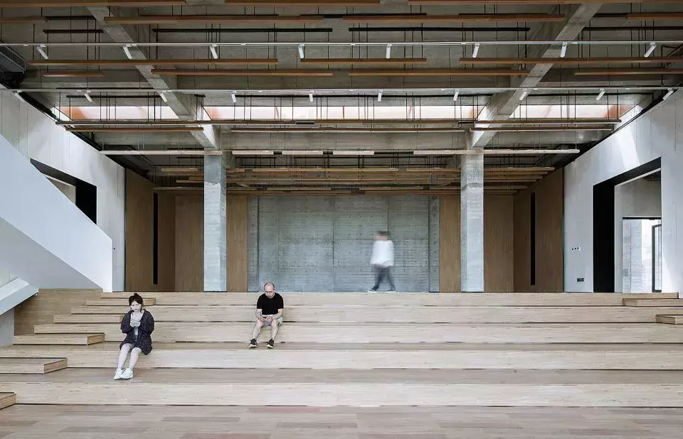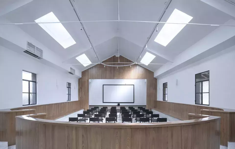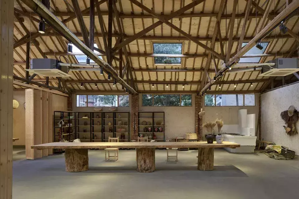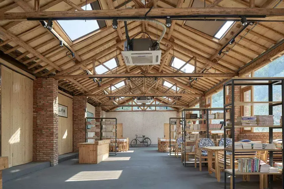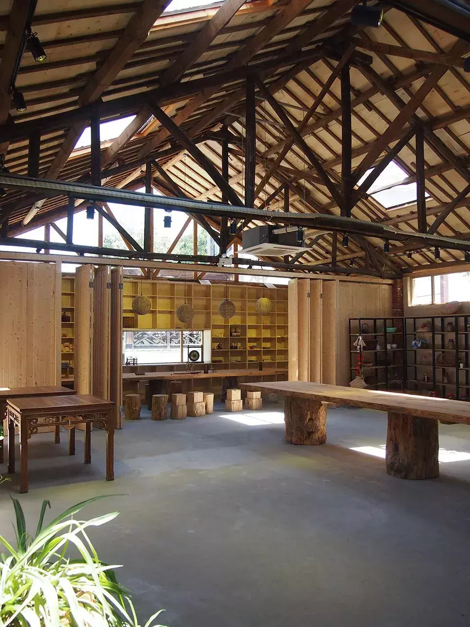 顶部每跨设置一个天窗,除了满足采光需要,更引入周边的山景,做为乡村记忆馆的核心功能空间,在这里能感受到自然山水和传统手艺,现代生活的融合。内部空间朴素自然,墙面内外一致,地面则用水泥做磨光处理,屋顶则是保留了原始木屋架的结构美感,软装也以原木为主,使建筑、室内融为一体。