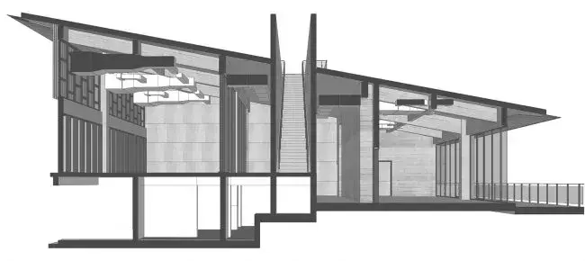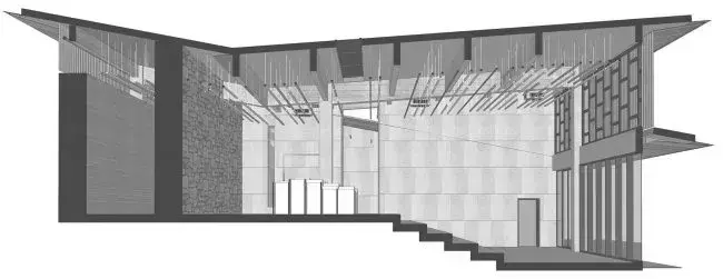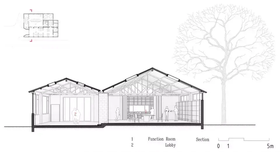 在方案构思阶段,设计师多次往返现场,发掘基地的特质;阶梯型田埂成为设计的一个被刻意强调的自然要素,主创设计师将一个长条形的体量搁置在水塘边的三级田埂高差之上,刻意保留的1500高差自然就形成了建筑室内或内庭院的两级空间。这个高差同时成为建筑外部形象的直接反应——坡屋面:较低的临水屋檐一侧,自然对应的较低的田埂一侧,檐口高度4米;较高的屋檐一侧,对应较高的田埂一侧,檐口高度6米;而内部高差的处理,在不同空间里有着不同的表达方式,客观地反应出空间的功能和节奏。