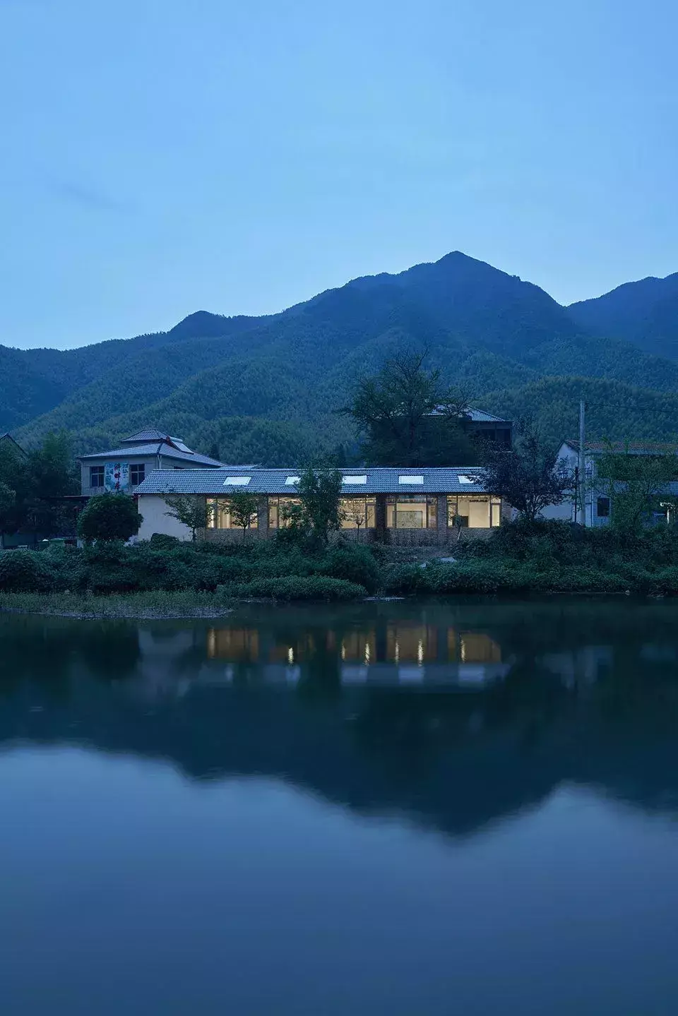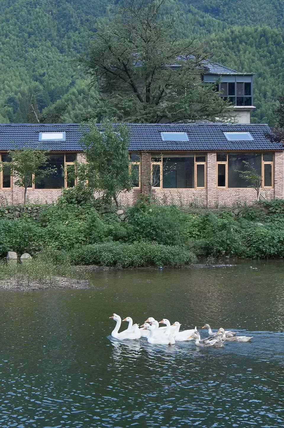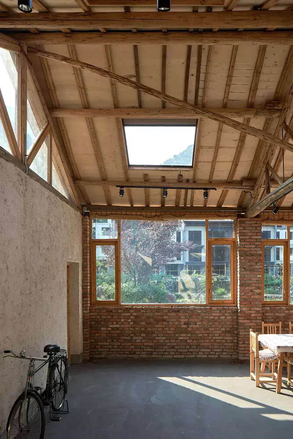 我们在大空间中尽量多的设置天窗,这样使得风景最大化的映入室内,也尽可能减少对周边民宅的干扰。我们找来村里的老工匠,认真听取他们的建议,就地取材,收集村民造房子剩下的红砖并以当地黄泥墙工艺做为建筑外表皮,门窗由木匠现场制作。因乡土材料的运用,建筑自然,朴素,融合于山水。