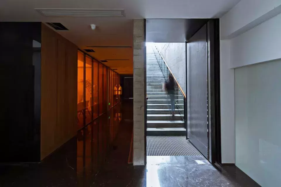 第一个盒子,高处是展厅,临水一侧低处是咖啡厅,两者之间的高差成为咖啡厅的四人卡座区,高差之间还植入了一个小盒子,它是高处的影音室,又是低处的咖啡吧台的背景墙;第二个盒子封闭的一侧是卫生间,开放向内院的是化妆间;第三个盒子是婚礼堂,借助高差自然形成了观众坐席;第四个小盒子是接待厅,第五个盒子高处是会议室,低处临水是餐厅,两者的高差被中间插入的直跑向屋面平台的楼梯所截断,把开放和私密两种空间性质直接分开。