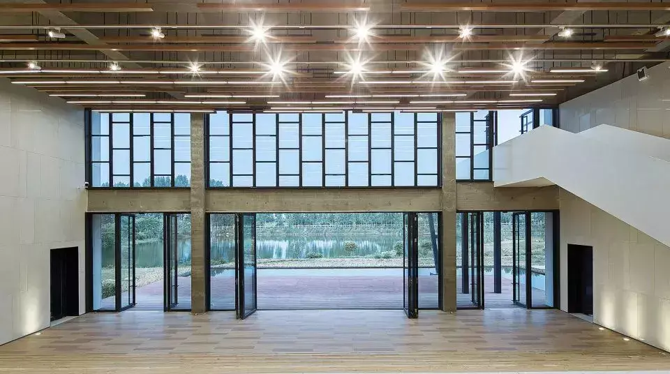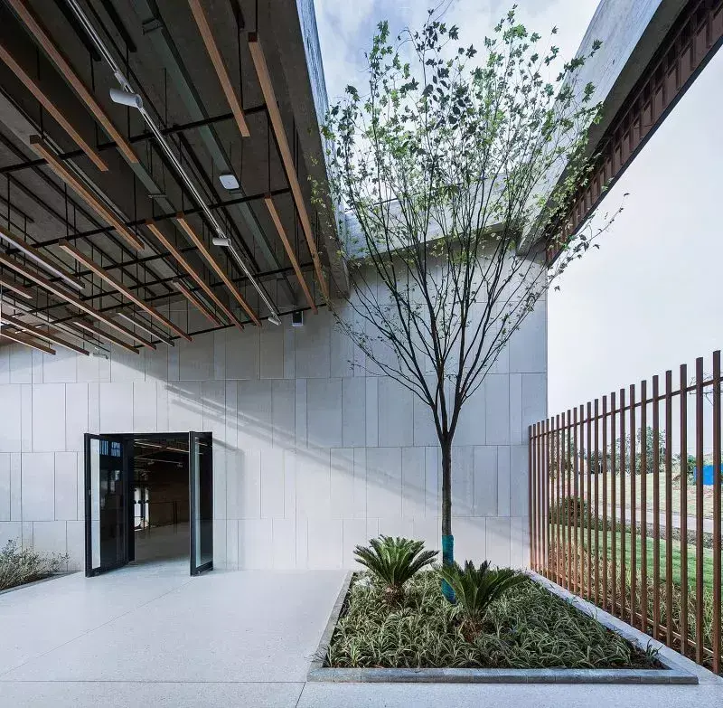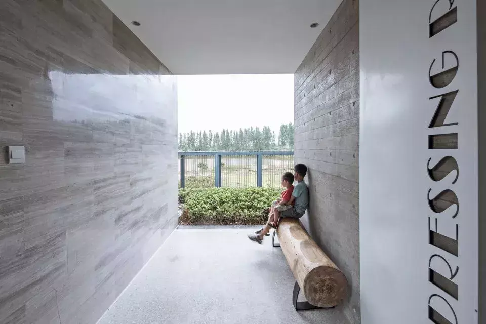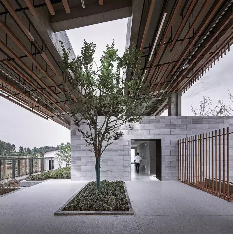 如前所述,项目选址在乡道隔着水塘的一侧,来拜访的游客,会在乡道的意杨林空隙里第一眼瞥见建筑完整的正立面形象,长且低矮;继续拐进项目的入口道路,会以一个45度角看到建筑的全景,拉长的线条带来透视感的收缩,加强了建筑的长度和水平观感;然后沿着田埂,步入长廊,到达入口门廊,才能拾级而上到门厅。或者是穿过门厅,看到建筑的较高立面的一侧。漫步带来建筑不同的观感,但也会发现这个建筑并不存在一个传统设计意义上的“主立面”,犹如柯布西耶的萨伏伊别墅,没有主要立面,也没有去强化入口形象,这是设计师的刻意为之,也是回应江汉平原这种平坦场地的无方向感。