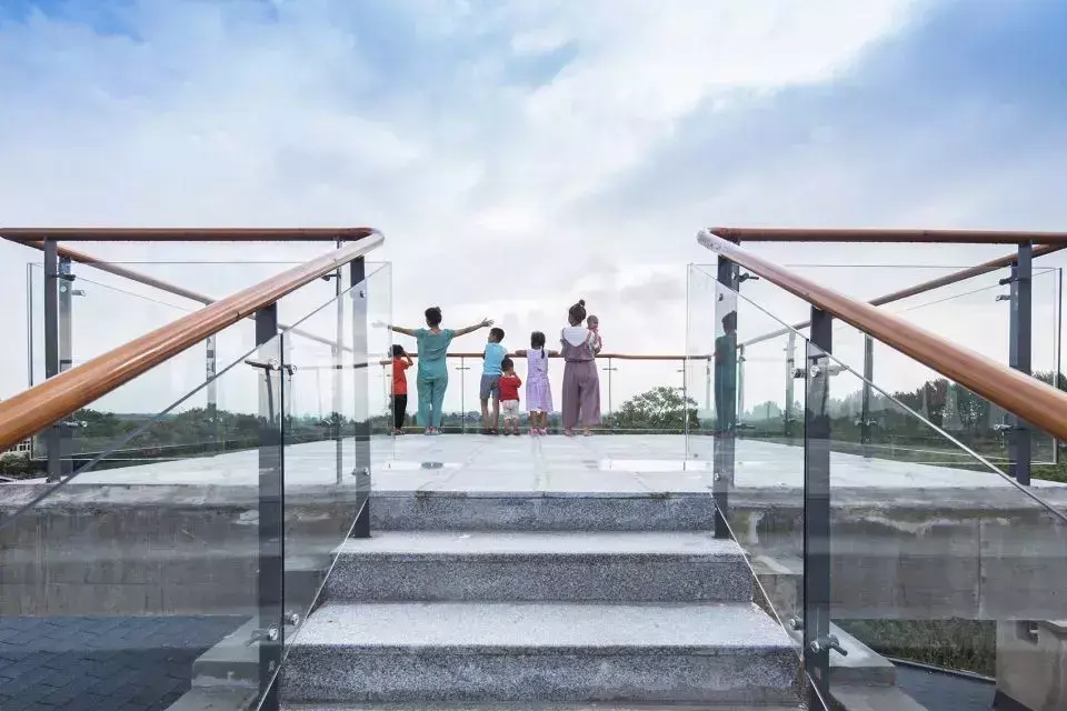 河畔是风的通道,看着河岸质朴的景色是一种享受,因此也是人们纳凉休憩的最佳场所。独柱回廊的结构设计灵感来源于户外遮阳伞,长20米、宽4.8米的大屋顶连接着檐廊,两根木柱夹着木梁的柱构造能有效抵抗侧向风力,使整体结构更稳定,同时也比使用一根截面尺寸更大的木柱,在视觉上要轻薄很多。独柱回廊的设计旨在最大程度减少立面上的结构构件,让户外空间更为通透开放。