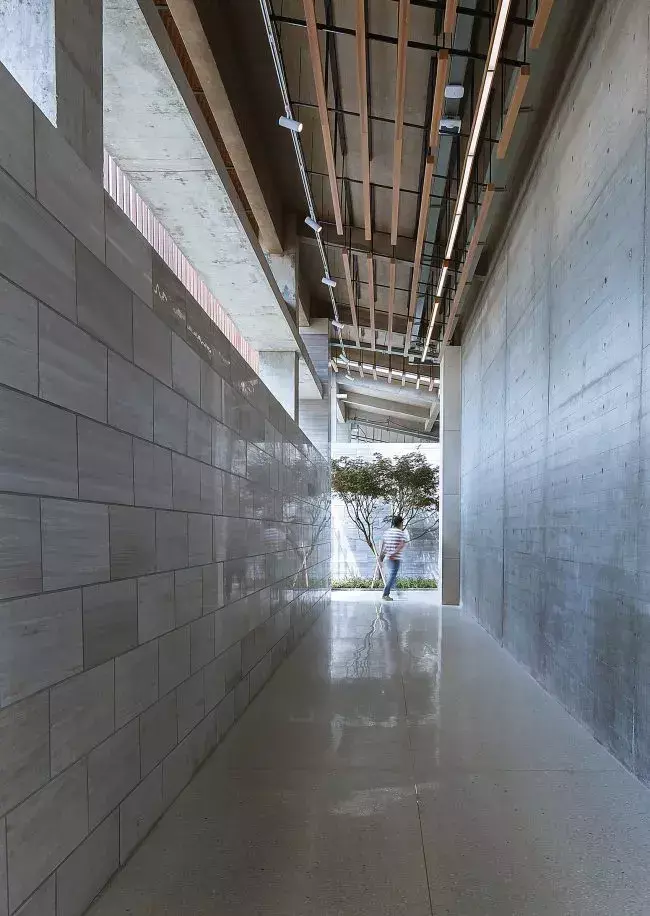 ▼两边清水木纹混凝土的高墙,裁剪出线性的天空