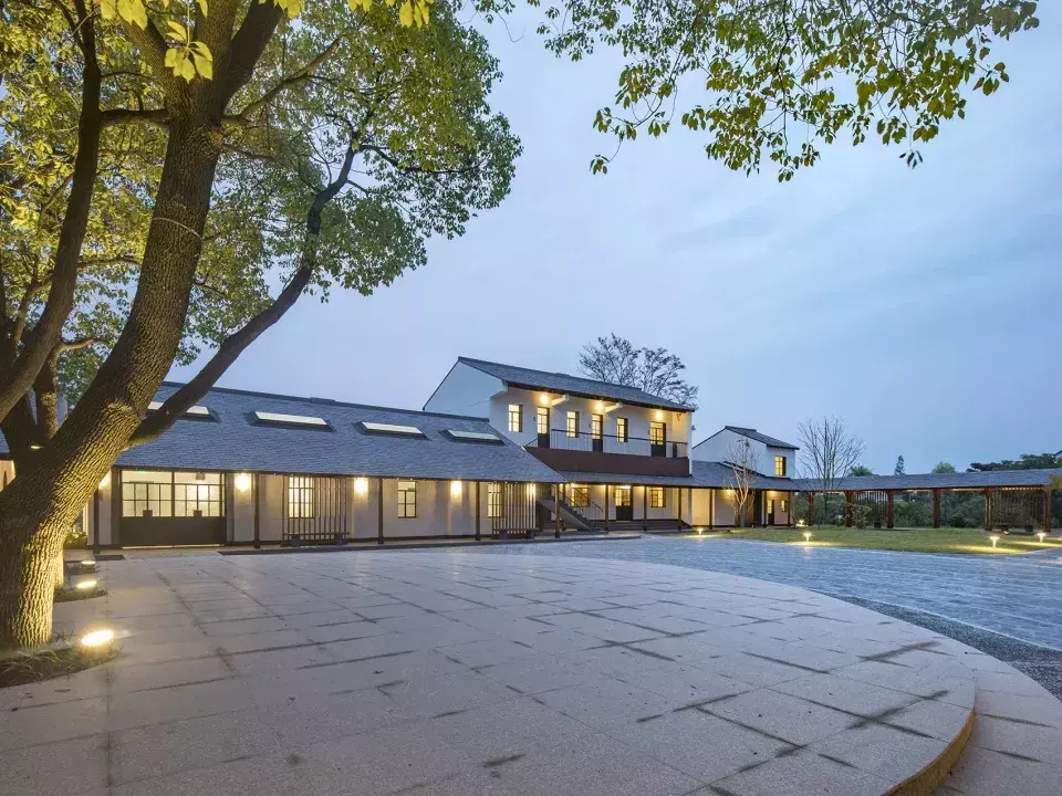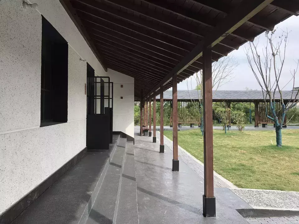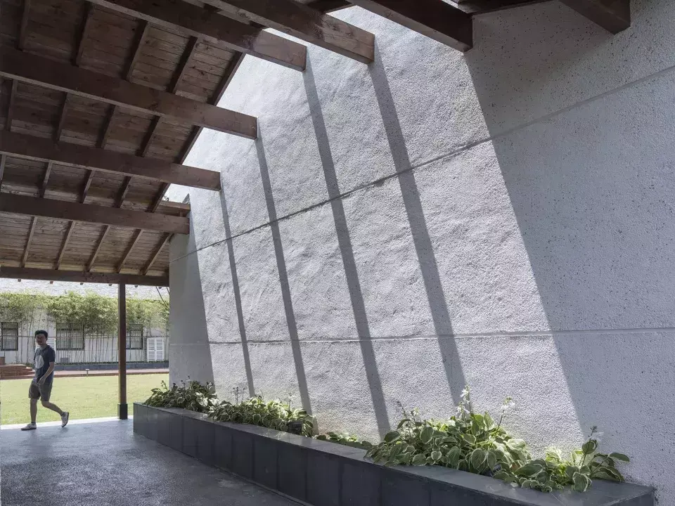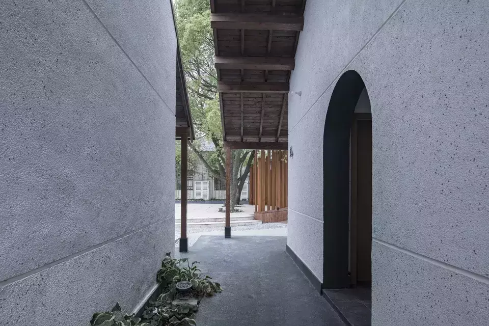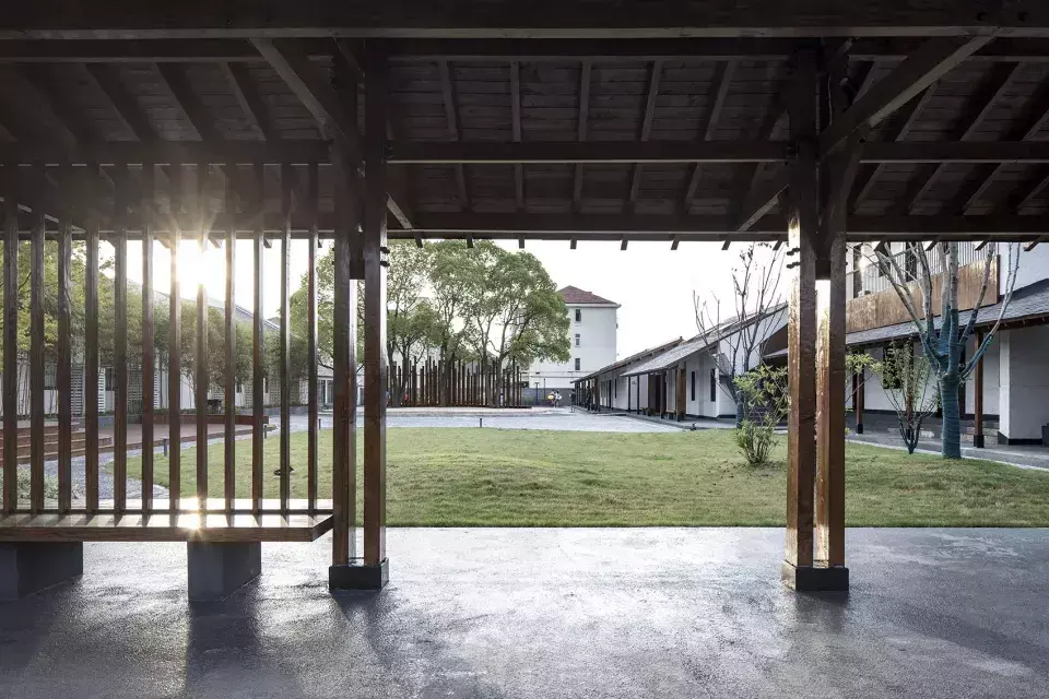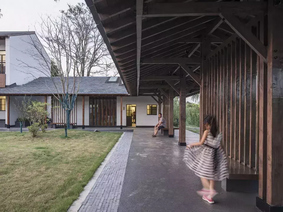 在设计初期,设计师思考着如何在这些房间之间设计一条互通的交通动线,檐廊的设计想法就应运而生。屋檐顺着现有建筑的屋面坡度挑出,檐口高度压至2.3米,檐廊将各栋建筑连接起来;直到东侧河畔,檐廊则转变为回廊,形成了连续的半户外空间,为人们提供交流、休憩、观景的场所。房子南面面向开放的活动场地,北面是围墙围合的后院,房子之间设计两处通往后院的过廊。