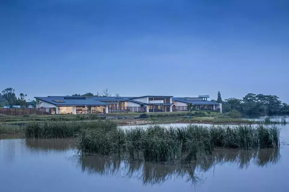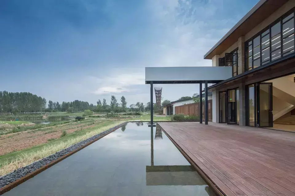 临水一侧屋檐高度4米,建筑总长度104米,长度和高度的比例关系形成了本项目的最大特征:建筑仿佛趴在水塘边,形成一个低矮水平谦虚的形象;同时,主体建筑平行于乡道,从乡道望过去,多条水平线集聚:乡道的护栏、水塘的边线、建筑前面的几级田埂、建筑的临水一侧的檐口线,建筑高侧的檐口线,内院及入口长廊的屋顶水平线,以及建筑屋顶的观景平台的水平线。这些水平线强化了江汉平原丘陵地形的特征。