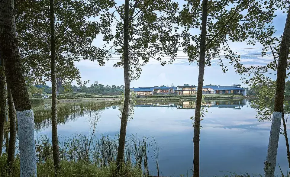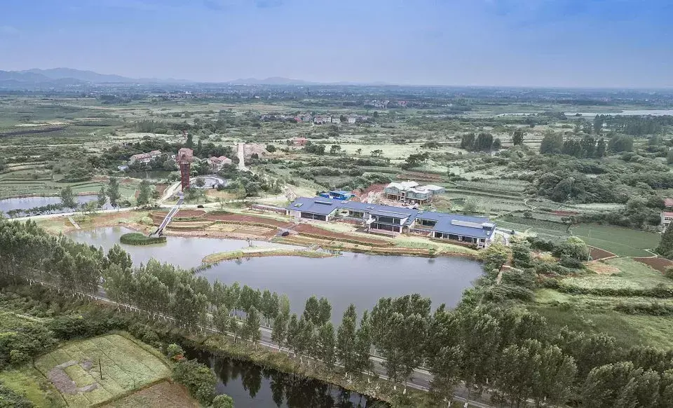 项目位于湖北省孝感市,场地是典型的江汉平原的丘陵地形。在项目伊始,设计师在考察地形后,将建设的基地选择在与乡道对面的水塘边,希望从高速下来的车辆,在拐进这条两侧种满意杨林的乡间道路后,第一眼可以远远看到建筑的全貌,从而形成一个对景的关系。