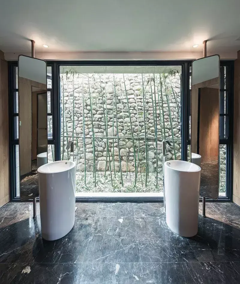 每个盒子的开窗,遵循着将外围景观限制与强化的目的。咖啡厅、餐厅和婚礼堂开窗均面向水塘,处于向自然开放的状态;尤其婚礼堂,落地窗扇可以完全打开,与室外的无边界水池一起,与水塘的水面融为一体;化妆间和接待室则面向内院,处于一种半开放的状态;而卫生间的落地窗面向一面当地毛石砌筑的景观墙,既达到开放景观的作用,又保证了私密性。