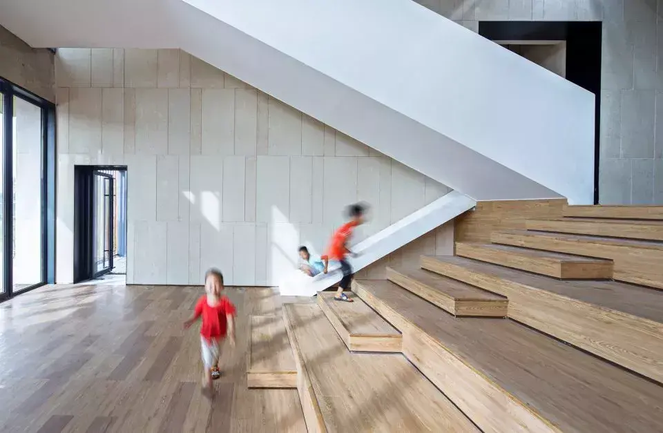 如前所述,建筑的横剖面是以田埂的1500高差为依据来设计的,五个盒子与这个高差的关系顺势成为室内空间的设计手法,同时高差也决定了室内的功能。