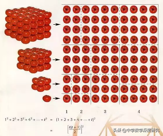由此我们可进一步归纳发现前n个自然数的立方和正好等于前n个自然数和的平方。