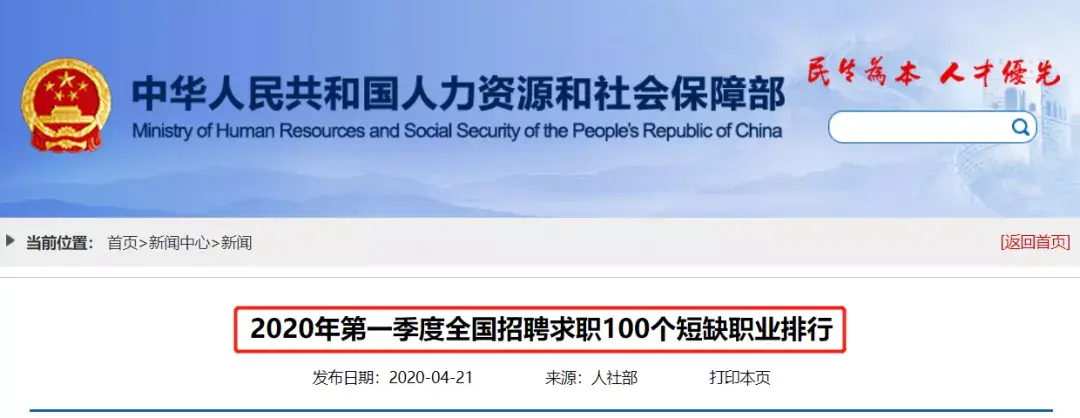 目前,中国就业培训技术指导中心发布102个定点监测城市公共就业服务机构人力资源市场《2020年第一季度全国招聘求职100个短缺职业排行》。这是2020年全国层面首次汇总发布人力资源市场招聘求职短缺职业排行。