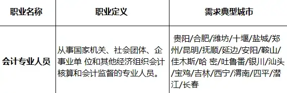 根据本次100个短缺职业排行数据,以下城市对于会计专业人员需求较为典型,比如吉林、长春、贵阳等城市。