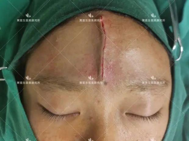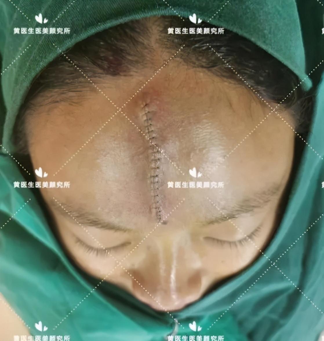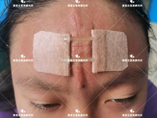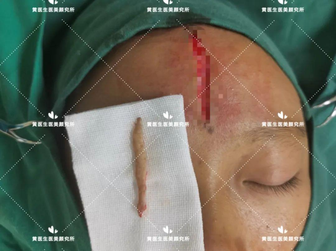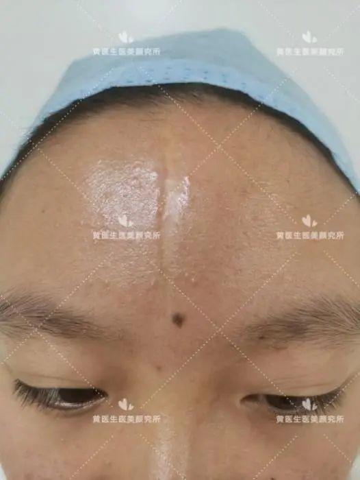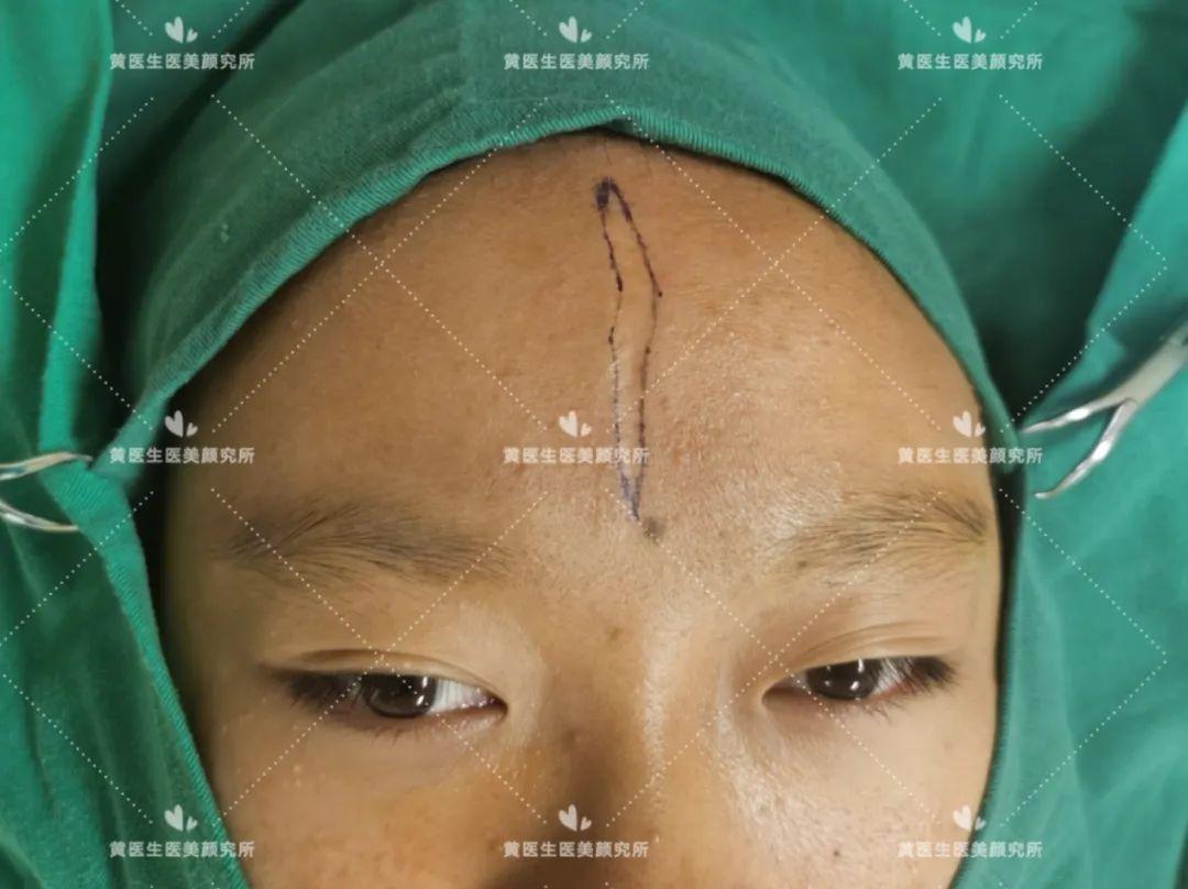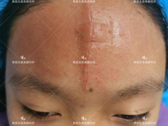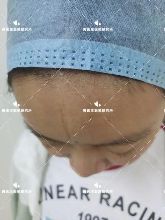 求美者额部正中凹陷性瘢痕,病史长达10年,查体:额部正中纵行可见大小约1.0㎝*7.0㎝,最宽处达1.2㎝,严重影响患者的容貌与颜值(化妆无法遮盖),详情如下图:
