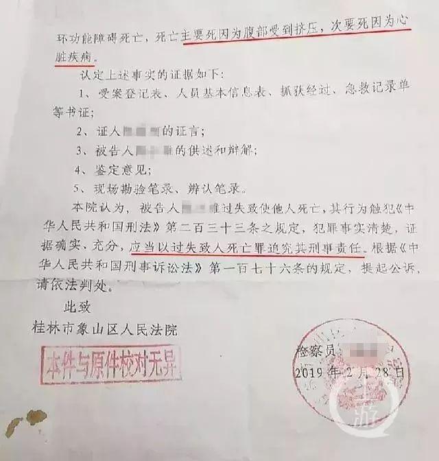 警察赶到后发现黄某已经脉搏跳动微弱,医生到达后宣布黄某死亡。据桂林市公安局象山分局鉴定意见通知书显示,“死者符合胸腹部受到挤压及心脏病导致急性呼吸循环功能障碍而死亡。”