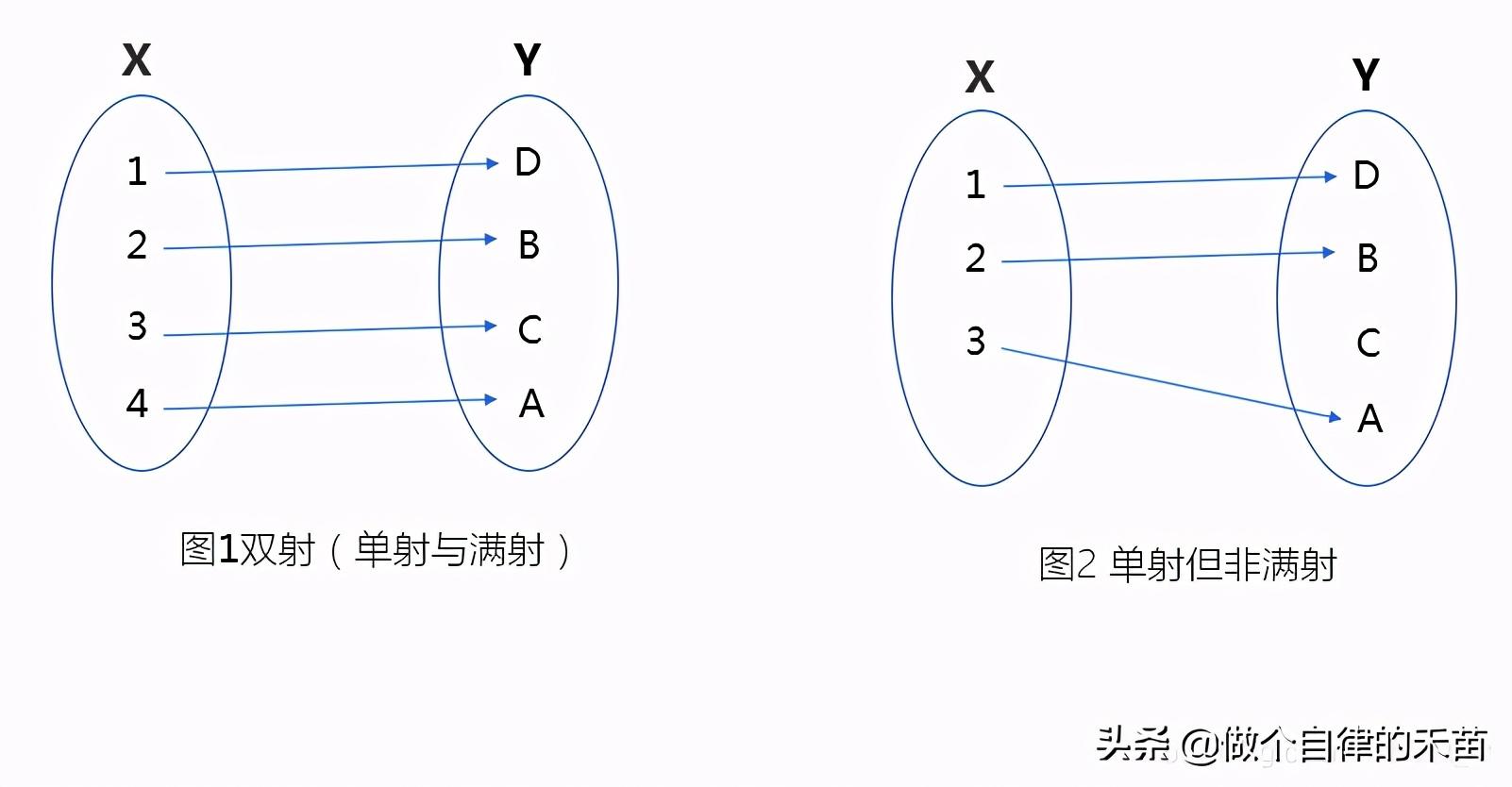 bijective,双射(也称一一对应):既是单射又是满射的函数。直观地说,一个双射函数形成一个对应,并且每一个输入值都有正好一个输出值以及每一个输出值都有正好一个输入值。 (在一些参考书中,“一一”用来指双射,但是这里不用这个较老的用法。)下面用几张图更好的理解一下。