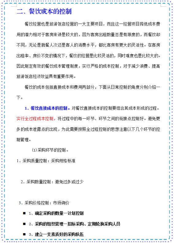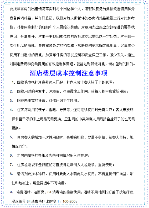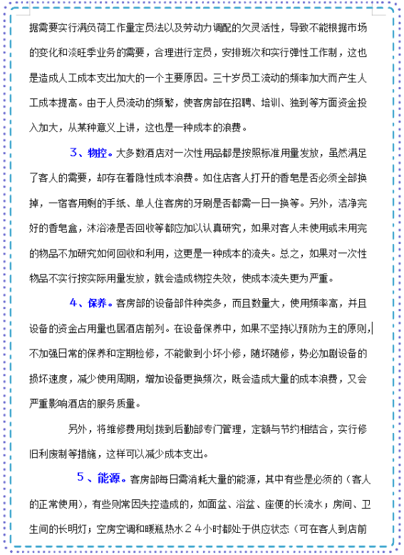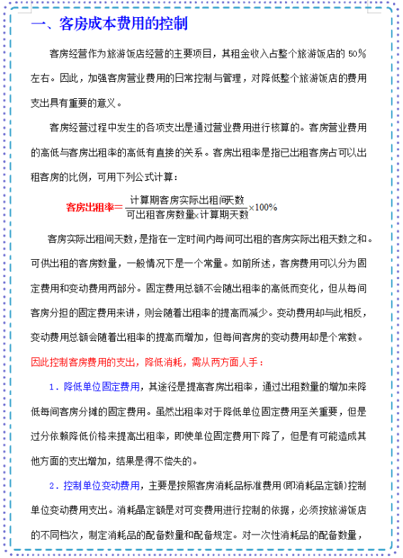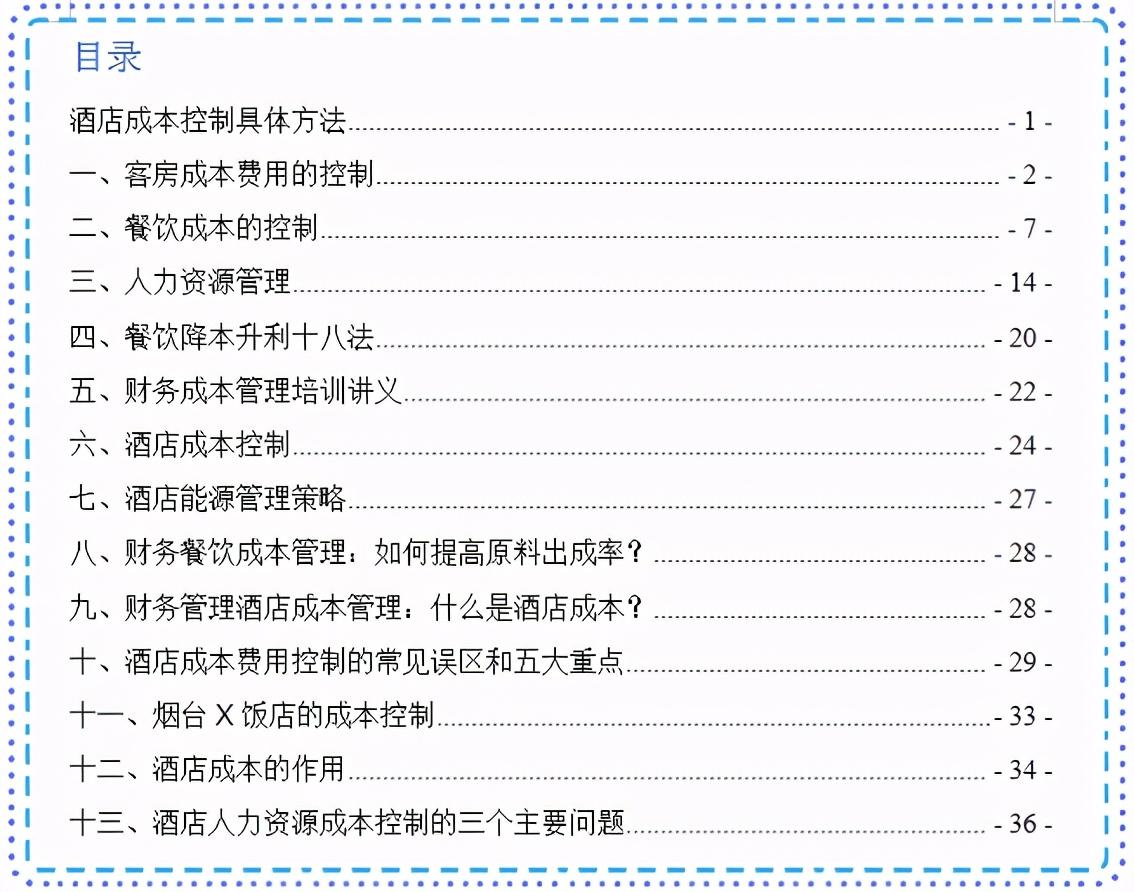 今天和大家分享一套酒店成本财务费用控制方法,共包含了13章内容,从客房成本控制、餐饮成本控制、人力资源控制等,再到酒店成本管理等等,总共40页,2.8万字,帮你成功降低酒店成本,最大程度实现利润最大化,做一个能为公司省钱的合格会计!