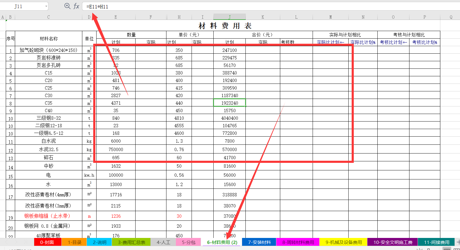 4、成本费用分析表四:建筑施工项目涉及的材料费用核算表分析