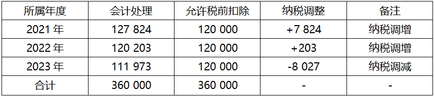 续上例,我们不难发现,2021年,会计处理,计入当期损益的金额为127824元(103084+24740);允许税前扣除的金额为120000元;两者的差异额7824元,需要在当年企业所得税纳税申报时纳税调整。各年度的纳税调整情况可参考表2。
