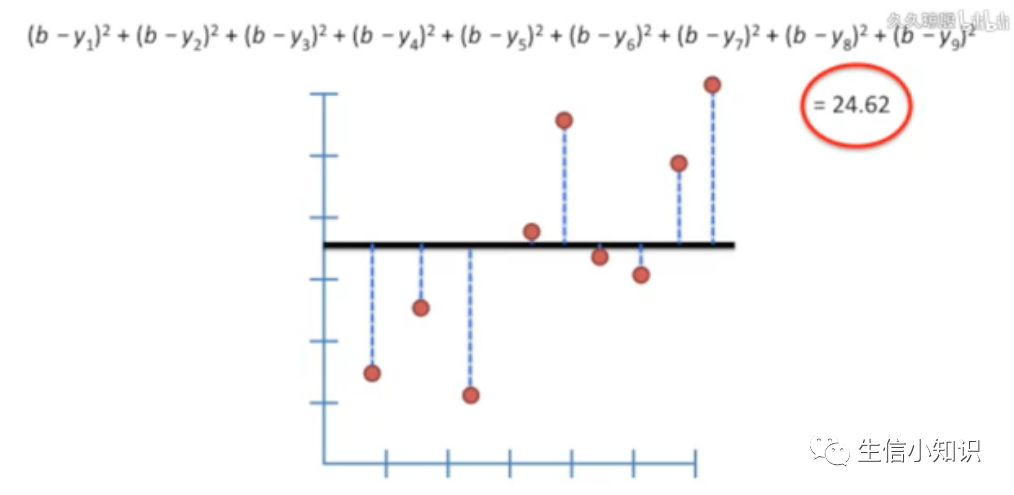 现在 (b - y1)2+ (b - y2)2+ (b - y3)2+ (b - y4)2+ (b - y5)2+ (b - y6)2+ (b - y7)2+ (b - y8)2+ (b - y9)2是衡量这条线与数据吻合程度的指标,它被称为残差平方和。