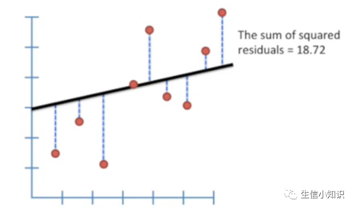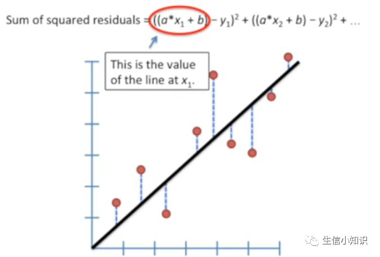 因为我们想要能给出最小平方和的线,这种方法用来找到 "a" 和 "b" 的最佳值的方法被称为最小二乘法。