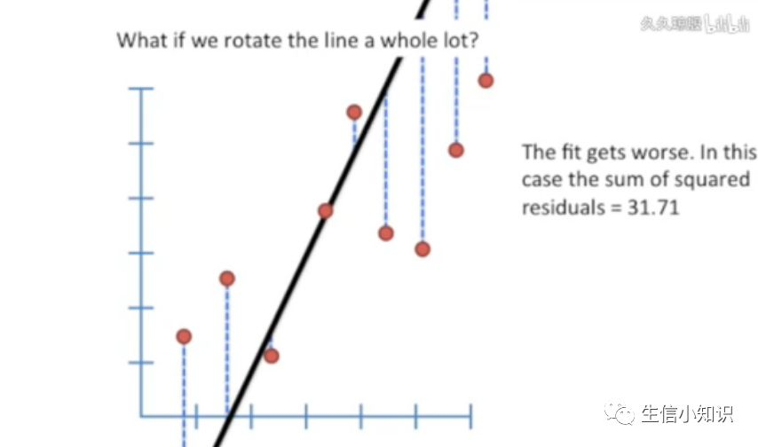 当我们旋转线越多时, 该值越来越低,如果我们将线路旋转了很多会怎么样?拟合变得更糟糕了,这个时候, 残差平方和等于31.71