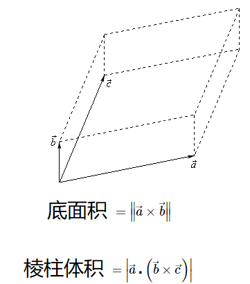 矢量的点积与叉积的混合积可以计算棱柱的体积, 如图: