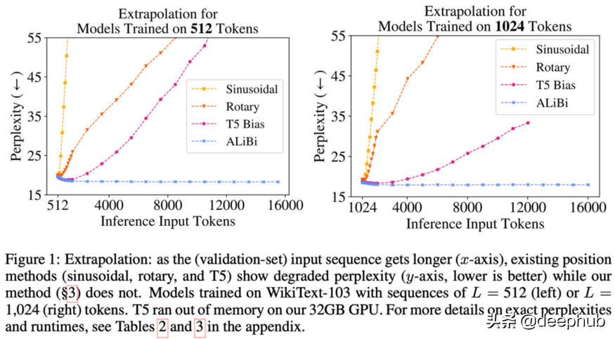 令人惊讶的是,Transformer可以很好地学习这种位置编码,并与类似大小的等效模型相比执行起来具有竞争力。有趣的比较发生在模型使用比训练时更长的序列进行推理时(见下图)。虽然现有的模型难以推广(即随着序列的加长,困惑程度急剧增加),但在ALiBi并不受到影响。