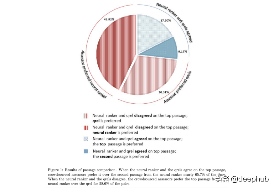 给定MS Marco的查询子集,他们运行查询并要求标注者回答以下问题:那个段落是与查询最相关的段落,被标注为相关的段落还是来自神经排序模型的最高结果?对于标注者来说并不知道段落是来自于哪里。结果表明,来自神经排序器的结果比标注的结果更受欢迎(见下图)。