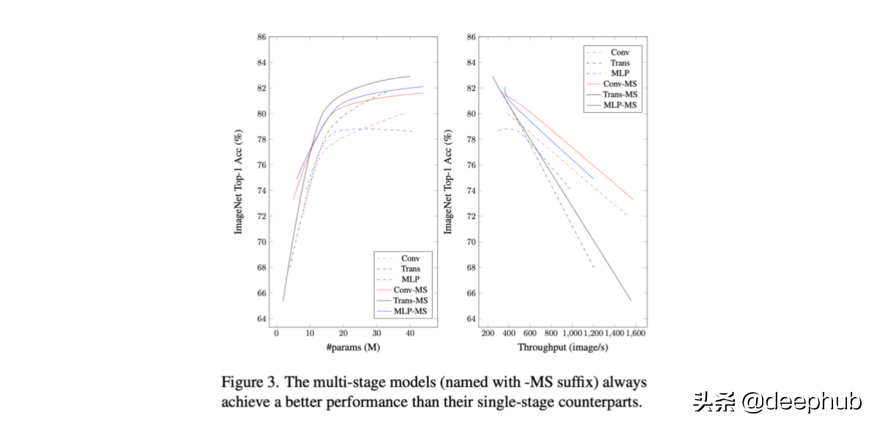 作者提出了一个相当简单的策略来正面比较这三种架构:将网络架构定义为嵌入、空间混合和下采样块的组合,并且仅在空间混合与不同架构之间进行交换。 需要注意的是,所有的架构都共享一个初始patch嵌入层,这实际上是对原始图像的卷积(即每个patch共享权值的线性投影),所以所有的技术都包含一个类似卷积的第一个层。