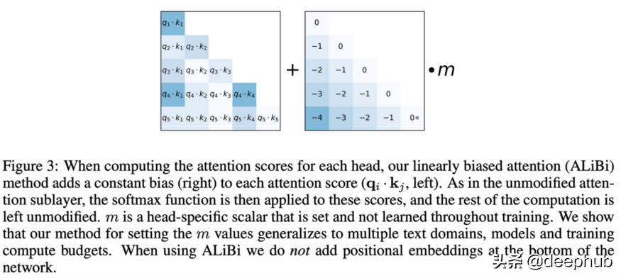 此处提出的方法仅依赖于向注意力矩阵(在 softmax 之前)添加一个偏差,该偏差与中心标记与其邻居之间的距离成正比(见图 B)。 这些偏差是固定的而不是学习的,并且缩放因子 m 被设置为一个超参数。