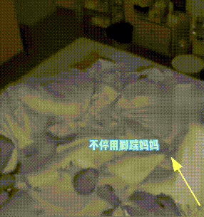 原本在睡觉的他,不知为何醒来并开始“活动筋骨”,小脚一直在动把妈妈踢醒了。