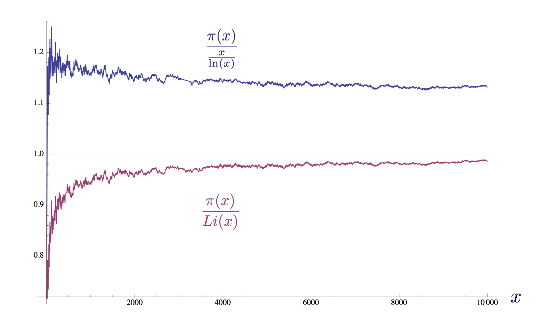 从这里可以很容易地看出,对数积分函数的近似值远远优于质数定理中的函数,仅在x = 10的14次方时“超调”了314,890个质数。然而,这两个函数都收敛于质数计数函数π(x)。Li(x)要快得多,但当x趋于无穷时,质数计数函数与Li(x)和x/ln(x)之间的比值趋于1。可视化为:
