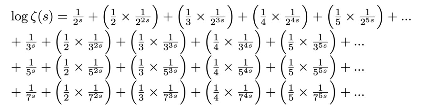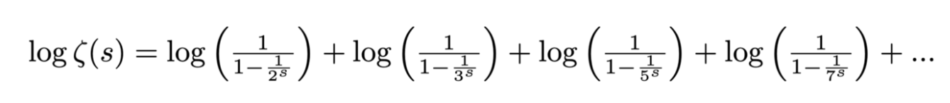 接下来,他使用著名的麦克劳林泰勒级数,展开右边的每一个对数项,创建一个无限和的无限和,每个质数级数的一项。