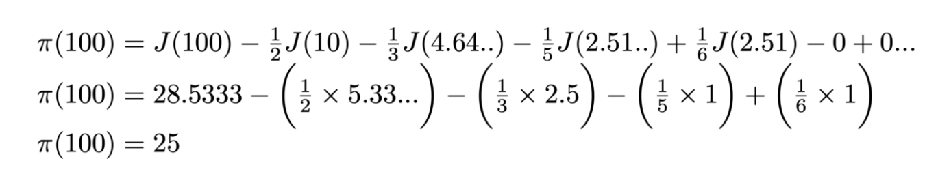 关于这个函数首先要注意的是它不是无限的。在某一项,计数函数将为零,因为x < 2没有质数。因此,以J(100)为例,函数将由7个项组成,因为8项将包含100的8个根,大约等于1.778279。所以这个质数计数项变成0,和变为J(100) = 28.5333....