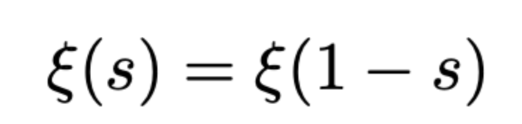即函数是关于垂直线Re(s) = 1/2对称的,ξ(1) = ξ(0), ξ(2) = ξ(-1),依此类推。这个函数关系结合欧拉积公式表明,黎曼xi函数ξ(s)在0≤Re(s)≤1范围内只能有0点。黎曼函数的零点就是黎曼函数的非平凡零点。从某种意义上说,黎曼ζ函数ζ(s)的临界线R(s) = 1/2对应于黎曼函数ξ(s)的实线Im(s) = 0。