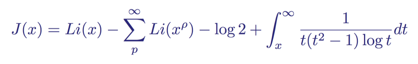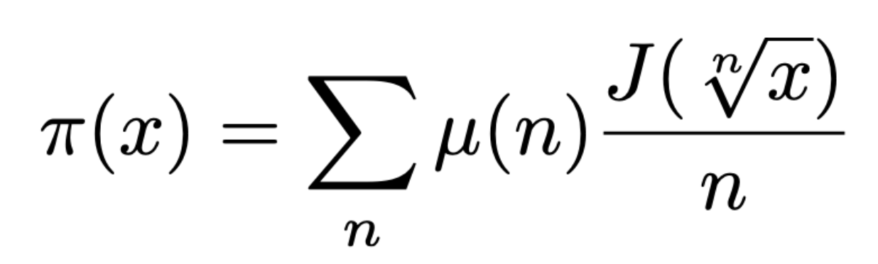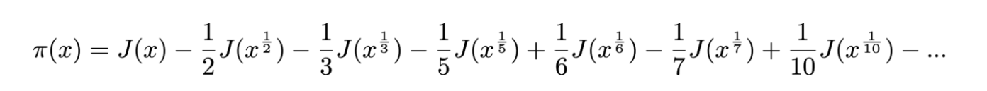 为了将J(x)的值与在x之前(包括x)有多少素数联系起来,我们通过一个称为莫比乌斯反演的过程恢复素数计数函数π(x)。结果表达式为: