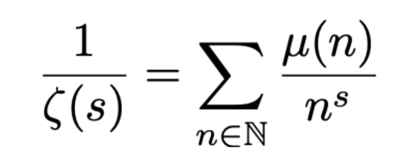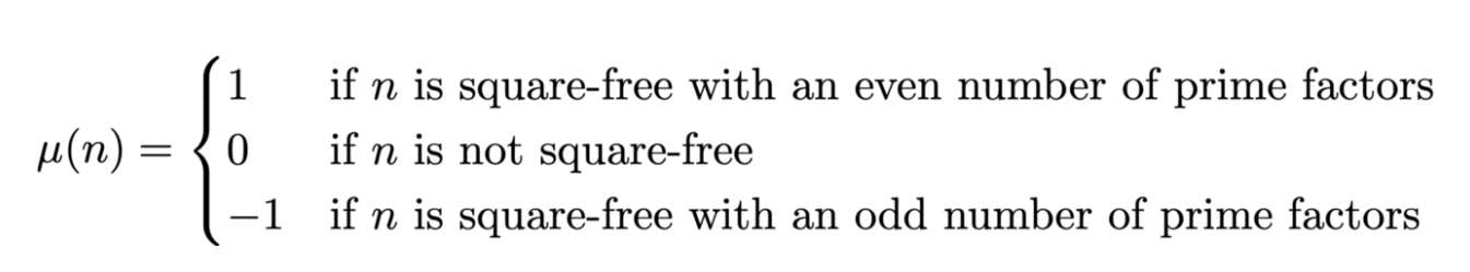 奥古斯特·费迪南德·莫比乌斯后来重写了欧拉积公式,创造了一个新的和。除了包含素数的倒数,莫比乌斯函数还包含所有素数因子的奇数和偶数乘积的自然数。他的级数中剩下的数是那些除以某个质数平方的数。其和,用μ(n)表示为: