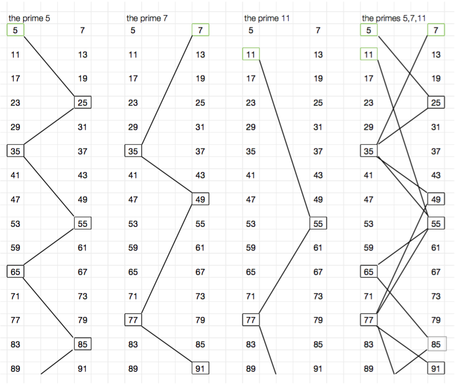 为了直观地说明这一点,我使用了一种我称之为“组合阶梯”的东西,这是一种简单的方法,可以看到函数生成的合数是如何为每个质数布局和组合的。在下图的前三列中,你可以清楚地看到质数5、7和11,它们各自的组合阶梯达到并包括91。第四列的混乱显示了筛子是如何除去除了质数之外的所有数的,这很好地说明了为什么质数如此难以理解。