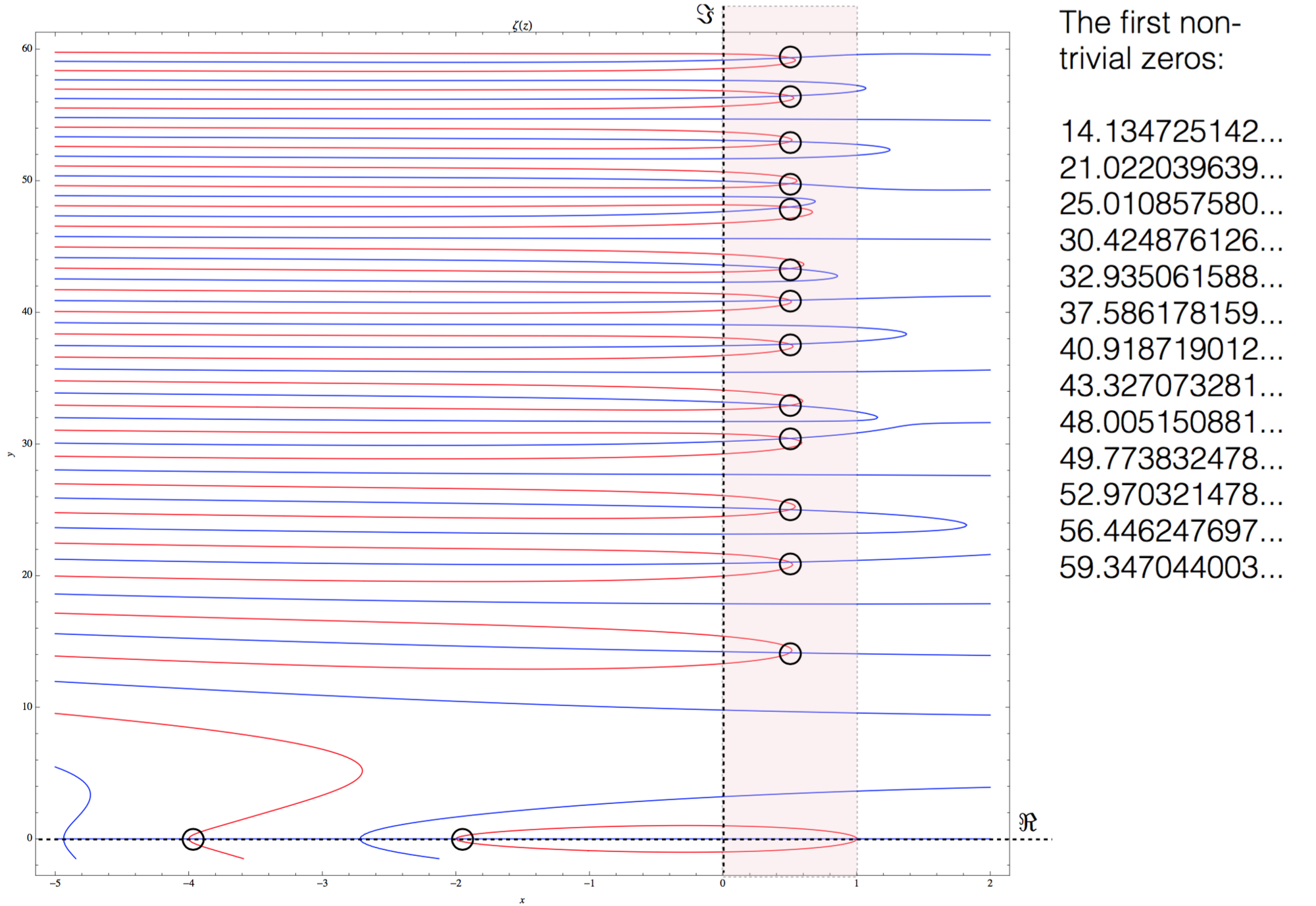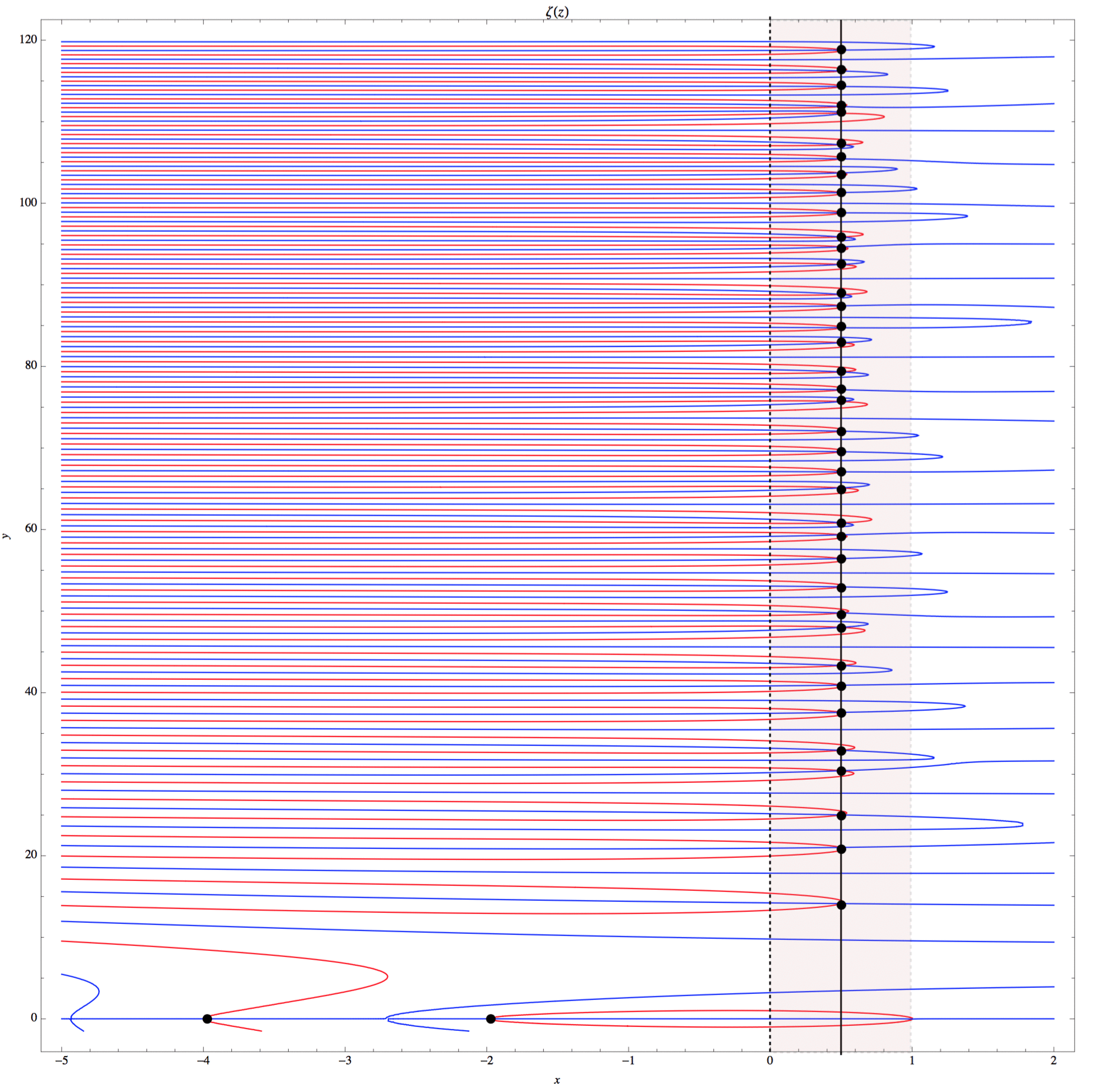 在下图中,Re(s) = 1/2是横轴。ζ(s)的实部Re(s)为红色图,虚部Im(s)为蓝色图。非平凡零点是水平线上红蓝图的交点。