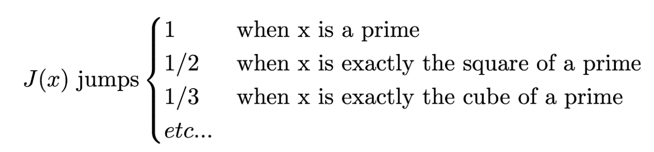 与素数计数函数一样,黎曼素数计数函数J(x)是一个阶梯函数,当: