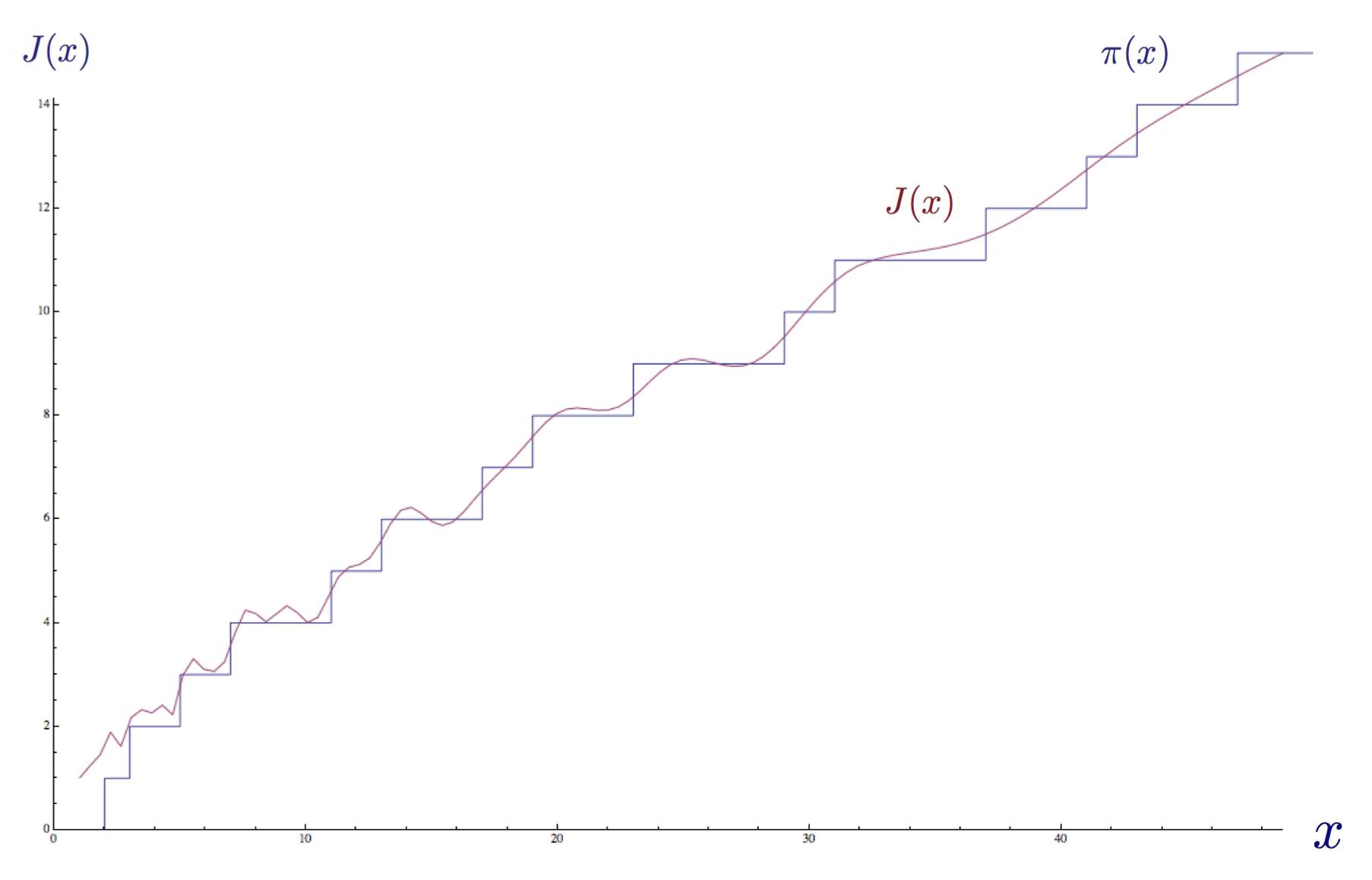 在上面的图表中,我已经用黎曼素数计数函数J(x)的显式公式来近似质数计数函数π(x),并对黎曼ζ(s)的前35个非平凡零求和。我们看到周期项使函数“共振”,并开始接近素数计数函数π(x)的形状。