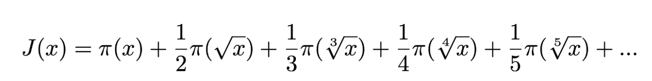 回想一下素数计数函数π(x),它表示在实数x以下的素数的个数。黎曼用π(x)定义了自己的素数计数函数,黎曼素数计数函数J(x),定义为: