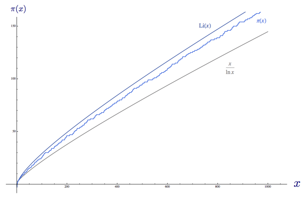 用当x趋于无穷时,质数计数函数π(x)将逼近函数x/ln(x),两者之间的比率将接近1。当x = 1000时,两个函数如下图所示: