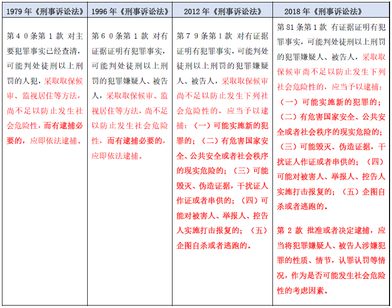 社会危险性,是指犯罪嫌疑人、被告人实施对社会造成危害的行为的可能。[1]从立法条文演进和司法实务看,在逮捕制度中,社会危险性条件经历了从无到有、从边缘到核心地位的转变。(参见图表二)1979年和1996年的刑诉法虽然规定了适用逮捕的社会危险性条件,但在语境上被称为“逮捕必要性”,采取取保候审、监视居住等方法,尚不足以防止发生社会危险性。由于涵义的模糊、实务中难以操作,2012年刑诉法修改时把逮捕分为“一般逮捕”[2]和“径行逮捕”[3],把一般逮捕的社会危险性细分为五种类型。