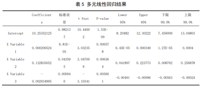 根据表 5 中数据,多元线性回归模型估计的结果为: