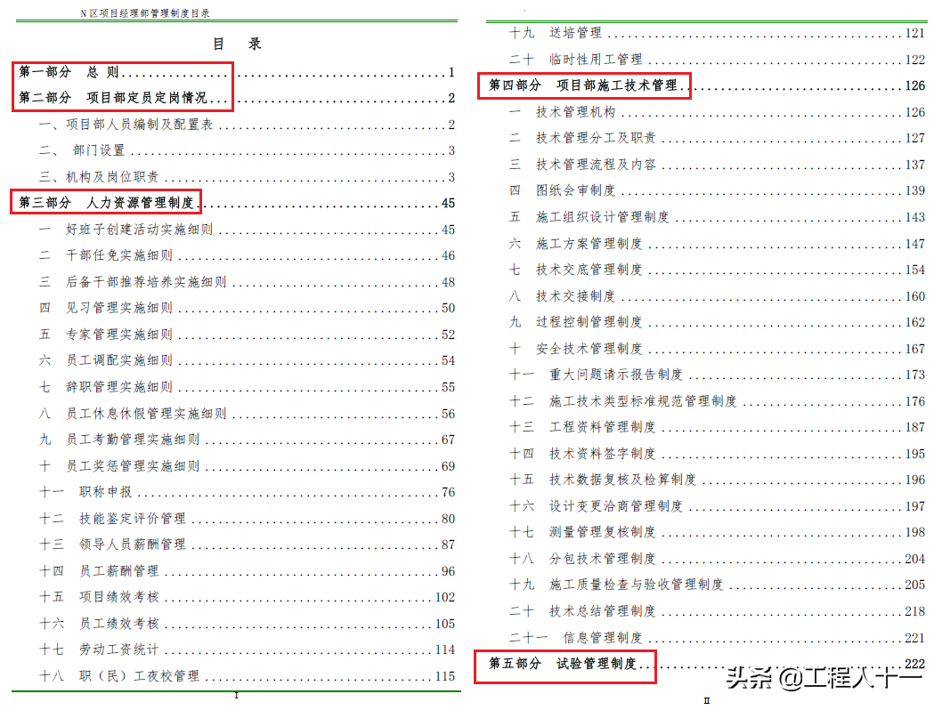 项目经理部管理制度汇编,主要从项目部定员定岗情况、人力资源管理制度、项目部施工技术管理、试验管理制度、成本及合同管理制度、安全质量环保管理制度、物资管理制度、设备管理制度、财务及资金管理制度、综合管理制度等十一个部分来阐述各项管理规定及制度措施,实施细则。