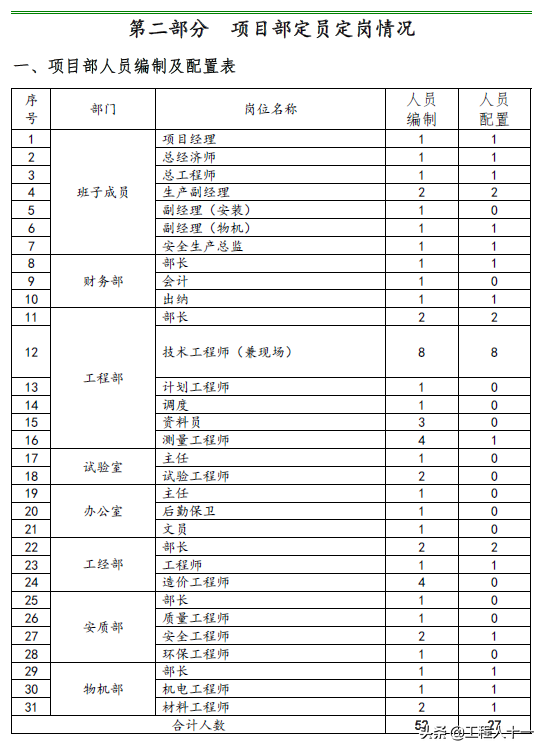 部门设置项目部设置五部二室,即工程部、安质部、工经部、财务部、物机部、综合办公室、试验室。