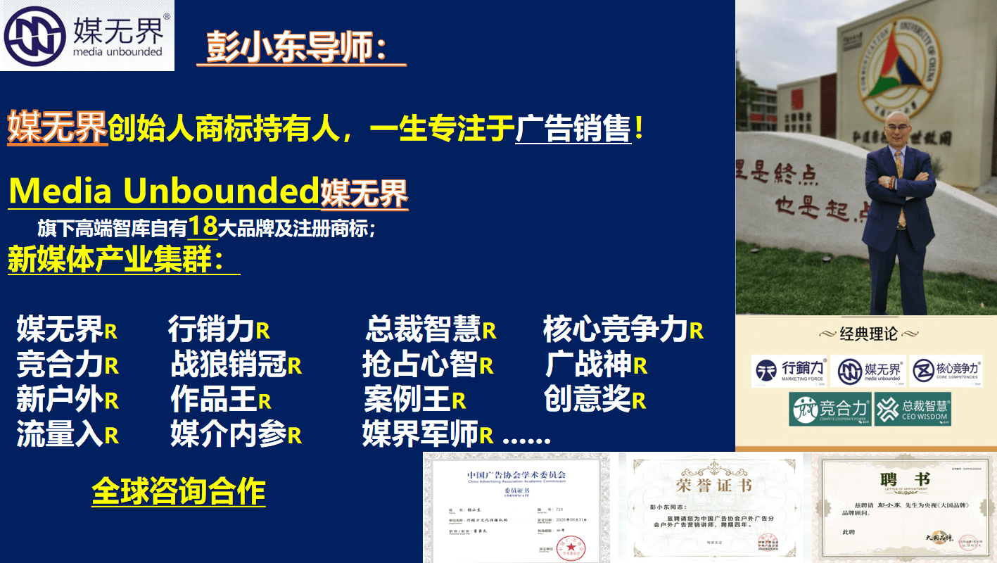 彭小东导师:户外广告效果=创意(灵魂)+点位(流量)+预算(信任+坚持)持续,差异和重复!(彭小东导师:媒无界创始人商标持有人,一生专注于广告销售!Media Unbounded媒无界旗下高端智库自有18大品牌及注册商标;新媒体产业集群:“媒无界R”,“行销力R”,“总裁智慧R”,“核心竞争力R”,“竞合力R”,“战狼销冠R”,“抢占心智R”,“广战神R”,“新户外R”,“作品王R”,“案例王R”,“创意奖R”,“流量入口R”,“媒介内参R”,“媒界军师R”等,全球咨询合作!)